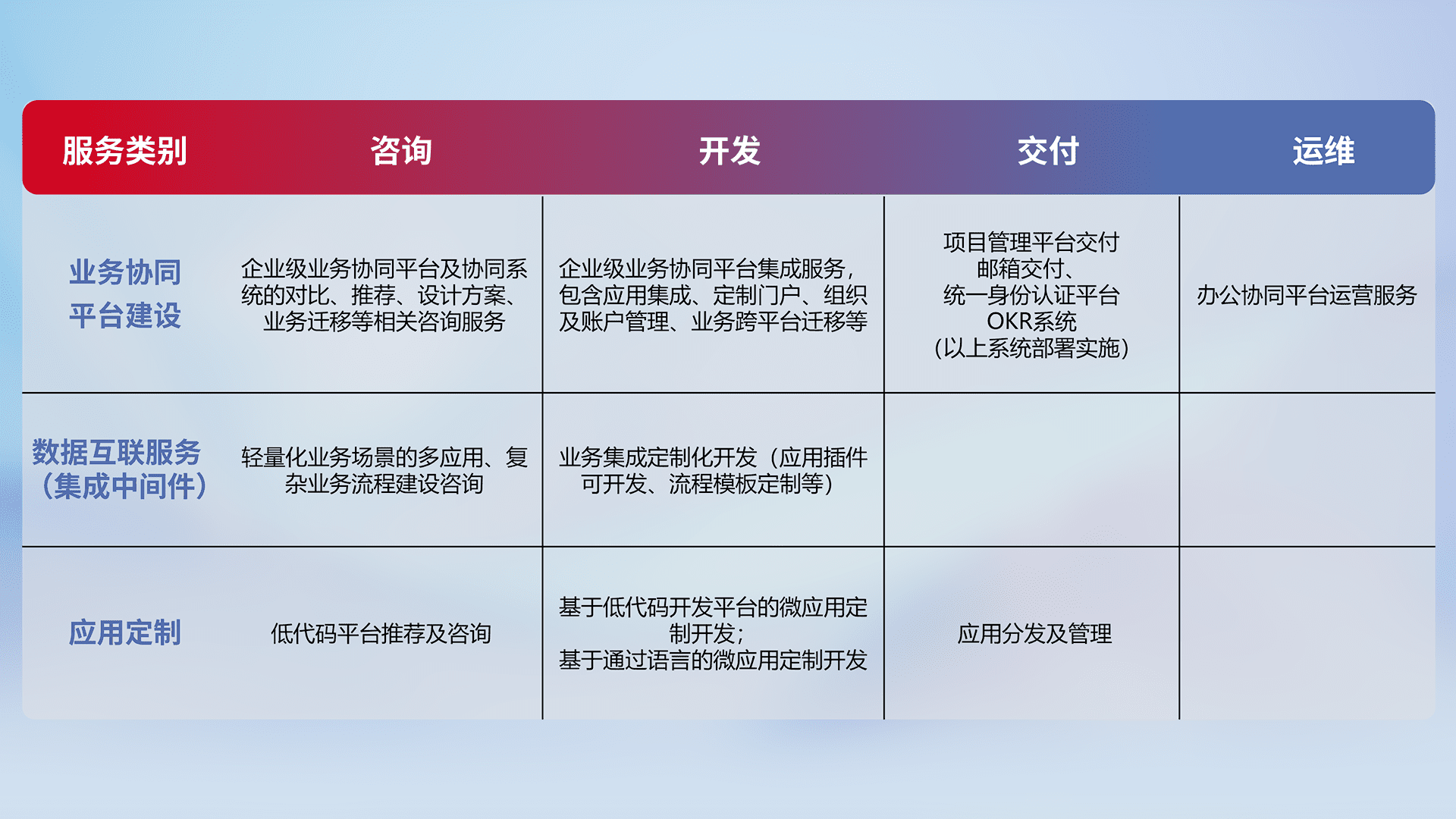 针对钉钉、、、、企微、、、、IDaas等平台级产品提供产品的规划、、方案、、、交付、、定制化开发等服务,,,,实现如统一协同办公、、、智能客户服务、、混合会议管理、、智能数据查询、、等业务场景,,实现数字化转型。。